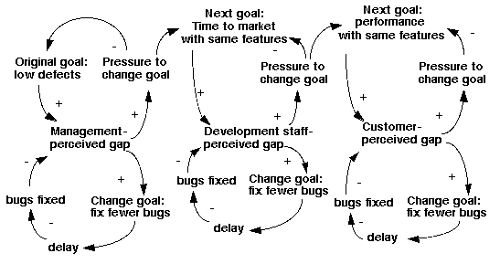 There was significant management pressure to find bugs faster and fix more bugs. The developers chose to institute code walkthroughs to find and fix more bugs per test cycle. This triggered a delay in the start of the system test runs. The result of this delay was finding and fixing fewer bugs (the left-most cycle in Figure 5).