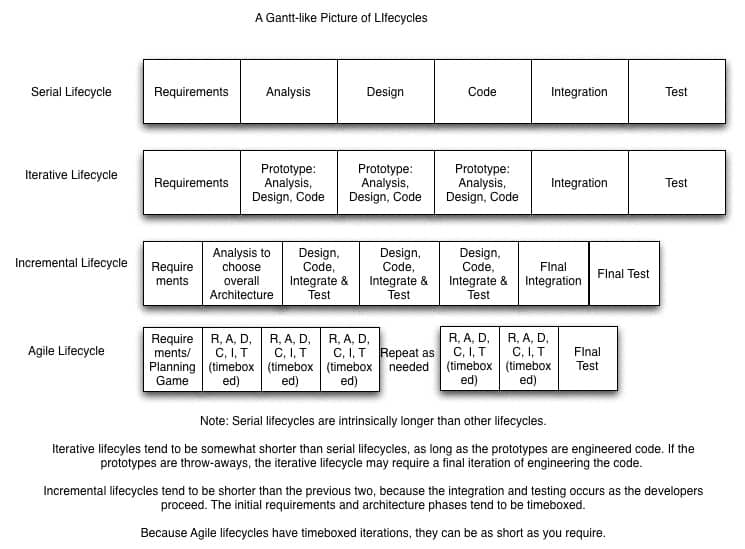 Here’s a brief explanation of the terms. A serial lifecycle is one in which all the phases occur in order. One phase has to finish before the next one starts. Many waterfall projects don’t require that each phase finish before next one starts, but do require that if you’re in phase n, you have to complete phase n-2.