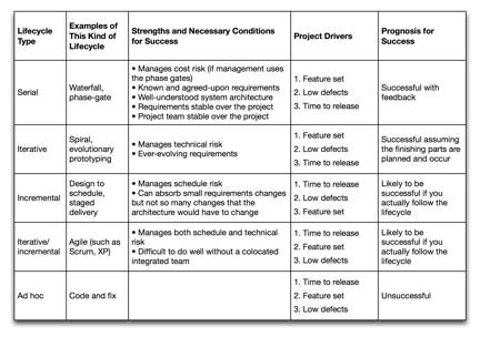 You may have noticed there’s an extra lifecycle in Table 1, the venerable ad hoc lifecycle, or code and fix. There is never a good time to use code and fix. Any lifecycle, even a serial lifecycle, will provide a better outcome than the code-and-fix.