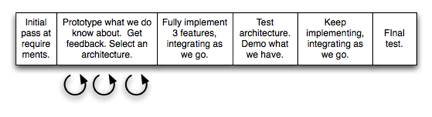 For one project, two organizations were collaborating to develop a product. They knew that they wanted to define the architecture earlier rather than later. And they knew that an architecture with no prototypes had no guarantee of working. So, they chose to use an iterative lifecycle to experiment with architecture (the prototyping) and then move into an incremental lifecycle to make sure the pieces worked as they developed them (see Figure 3).