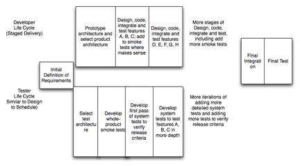 In this project, the developers used a staged delivery lifecycle to add features by chunk. The testers were not truly integrated into the project, but were close to the developers. The testers chose to use a different incremental lifecycle—design to schedule—because they were sure they would run out of time and wanted a breadth-first approach to testing the features.