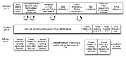 A project with hardware and software requires a variety of lifecycles. In this project, the hardware (electronic and firmware) groups used an iterative approach until they went to fabrication. The firmware group used an iterative approach to prototype the hardware and then used an incremental approach for the firmware. The software group used Scrum in three-week timeboxes (see Figure 5).