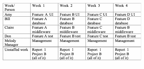 With this picture, you can see who's working on what–and whether those people are multi-tasking–and how much work is not staffed. Now you can estimate how many people you would require to staff the unstaffed work.