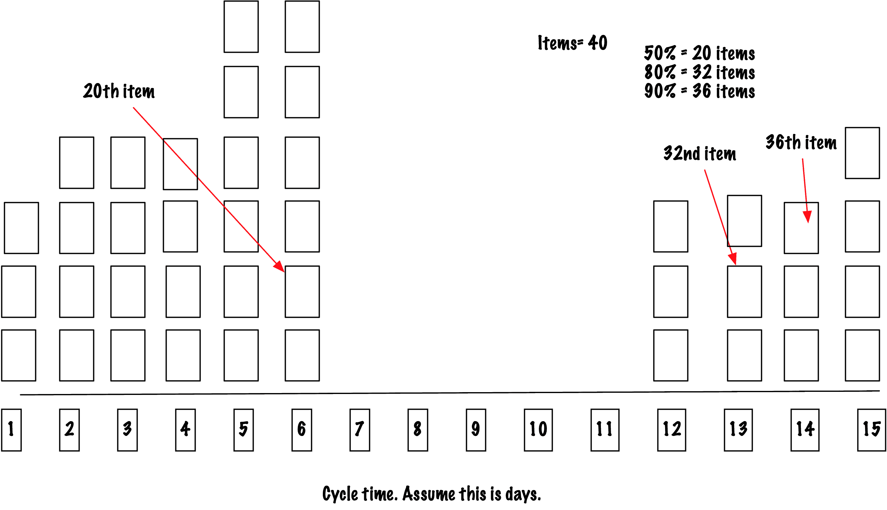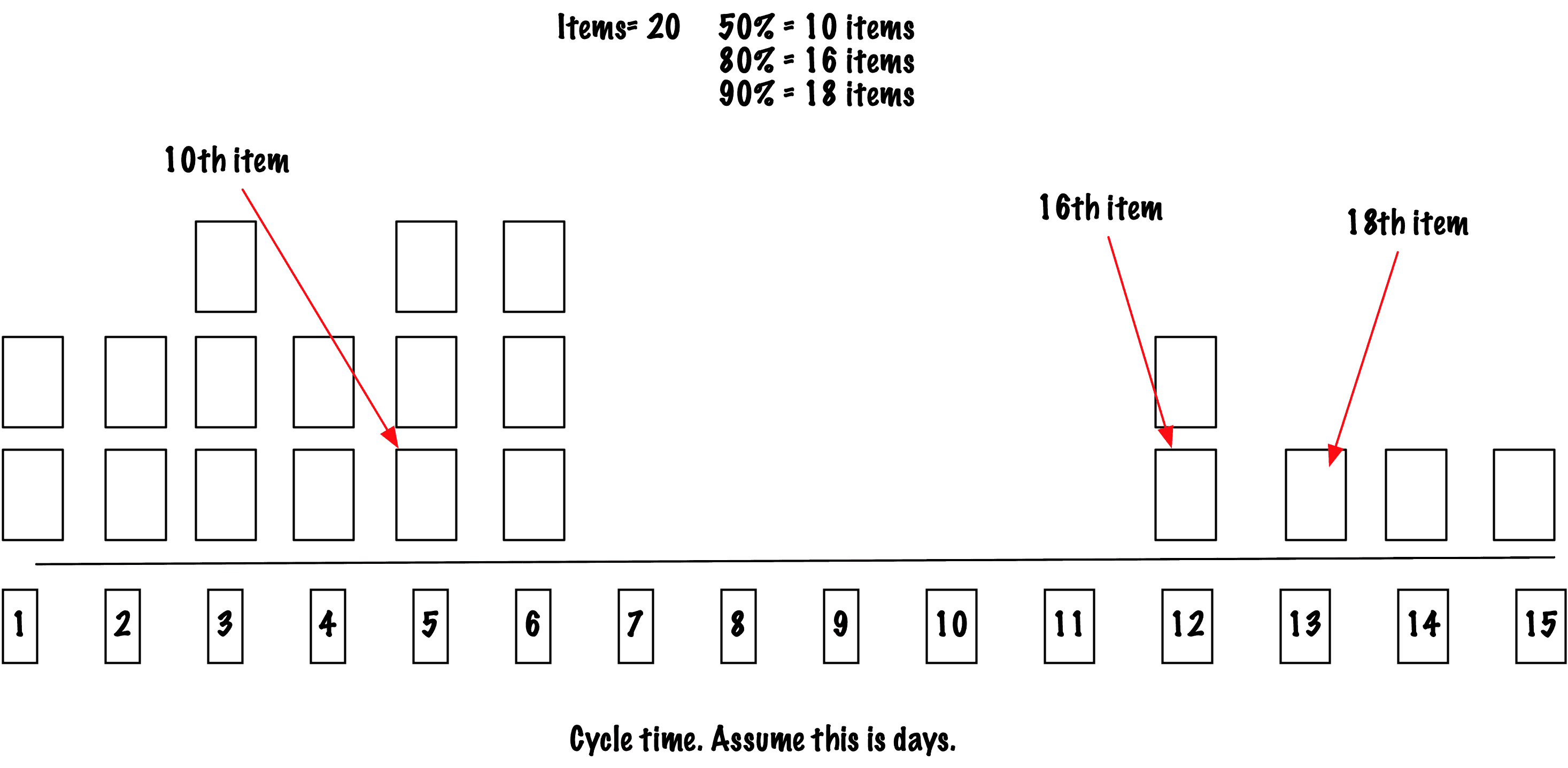The 50% confidence is at 6 days. (If you assume everything has a cycle time of 6 days, you would be right about half the time. You would be wrong about half the time.) If you want 80% confidence, you would need to use 13 days. And for 90% confidence? You'd have to use 14 days for cycle time.