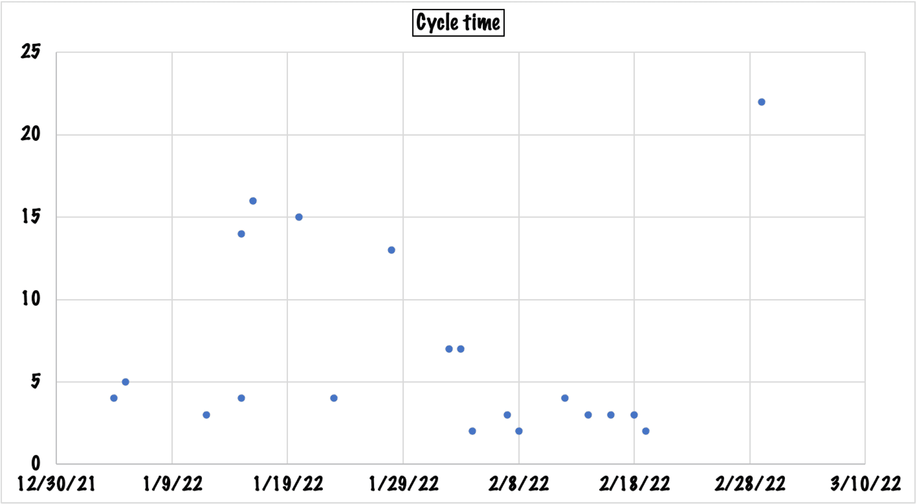 That means anyone can count the stories in a previous feature set, measure that feature set's cycle time, and repeat for all the feature sets. Plot those feature sets with the number of stories on one axis and the cycle time on another axis. This cycle time image above is for features, but it's the same idea for feature sets. (Because your manager wants to know your start and end time for the feature set.)