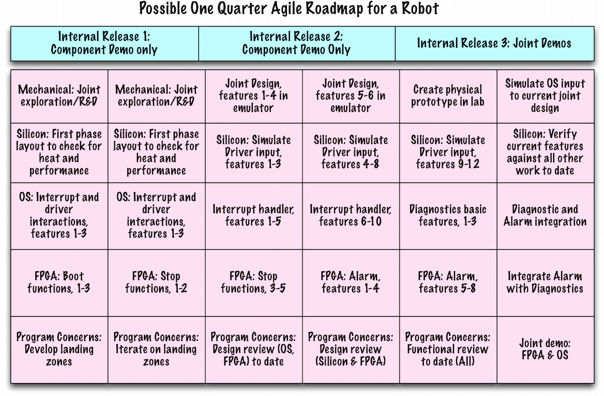 We did use things like the road map table in the lower levels of the large project, but we also had more formal planning (traditional) efforts using tools. So inside of a part of the project we could be agile using concepts like the road map. Where the teams had real “work” was at the Integration and Integration Test efforts. We often saw problems for the first time, when we integrated (hardware-hardware, software-hardware, and systems). Another thing we saw quite often was as the hardware became “solidified” and a problem in it was found, we hear statements like “we will fix that problem in the software”. This cause “new work” to be defined to the software teams.