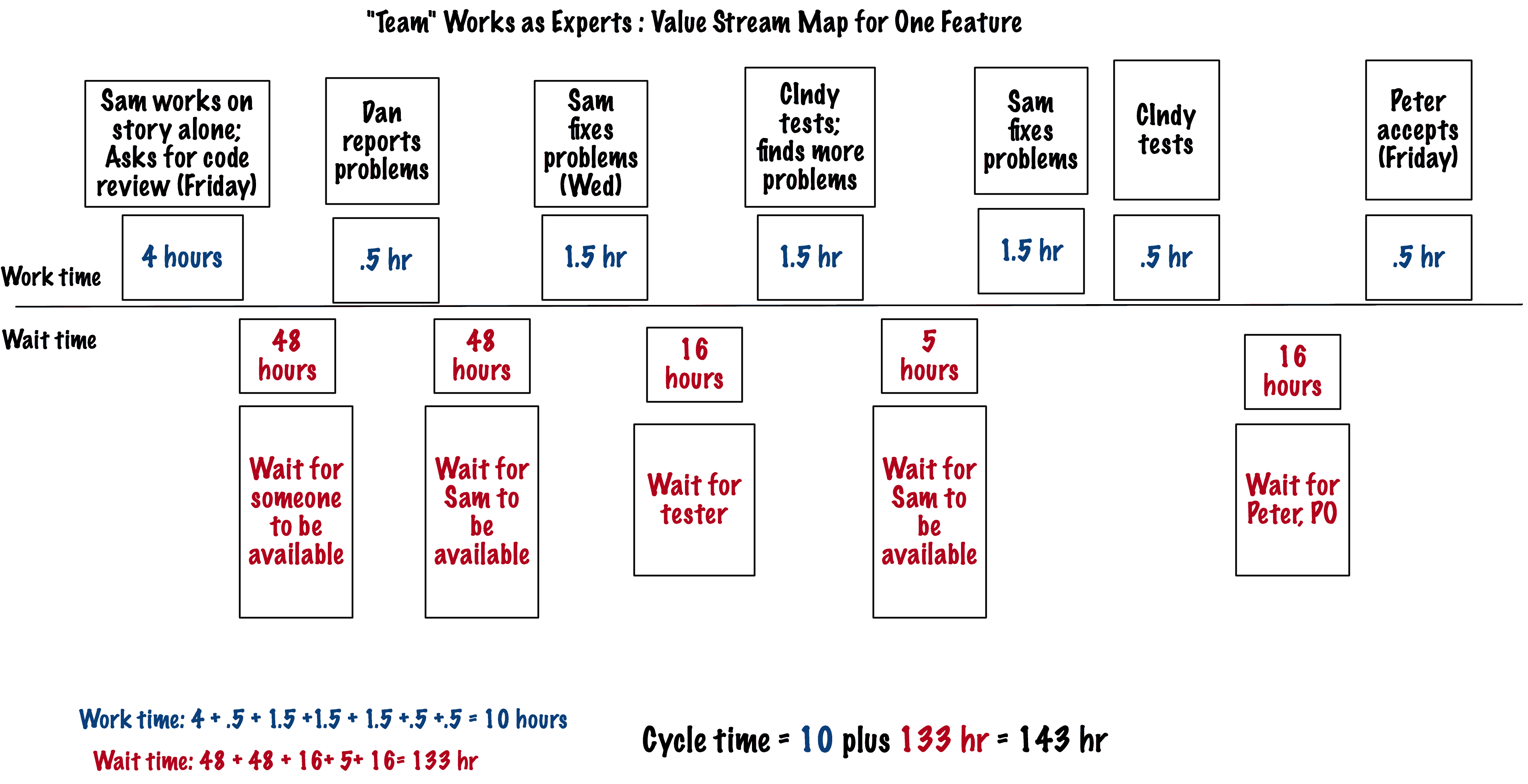 She showed him the value stream map above. “This supposed team has 10 hours of work time and 133 hours of wait time just for one feature. Instead of working on this feature, the team spends 90% of their time waiting. They're not actually twiddling their thumbs. They start more work, so they have the multitasking problem when they return to this work. But I'm ignoring that so you can follow my calculations.”