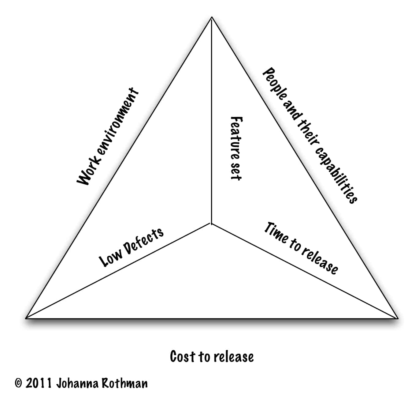 If you've been managing projects for a while, you know that there is no iron triangle. Instead, there is more of a project pyramid. On the outside, there are the typical corporate constraints: Who will work on the project (the people and their capabilities), the work environment, and the cost to release. Most often, those are fixed by the organization. “Bud, we'll give you 50 people, 5 months, and this pile of money to go do that project. OK?”